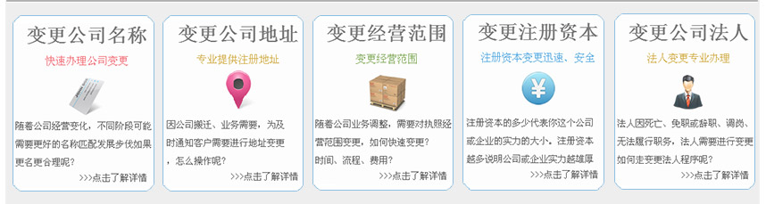 變更公司名稱 變更公司股東(股權(quán)) 變更公司法人 變更公司地址 變更公司經(jīng)營(yíng)范圍 變更公司注冊(cè)資本