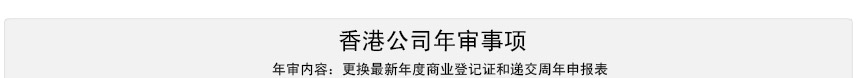年審包含:更換商業(yè)登記證、制作并遞交周年申報表、提供法定注冊地址、法定秘書及秘書服務(wù)。